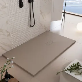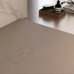 Duschwanne Mineralmarmo Dubai in taubengrauer Farbe, ultraflach, 3 cm, aus hochwertigem Marmorharz mit Steineffekt. Rutschfest, extrem widerstandsfähig und mit zuschneidbarer GelCoat-Beschichtung. Design-Ablaufgitter aus Edelstahl in der gleichen Farbe wie die Duschwanne. Abfall inklusive.