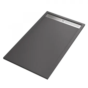 Receveur de douche Marmoresina MOON ultra mince de 3 cm de couleur anthracite en marbre minéral de haute qualité avec effet pierre. Ultra-résistant et avec revêtement GelCoat peut être coupé à la taille . Grille de décharge latérale design en acier inoxydable. Produit et livré en 9-10 jours ouvrables.